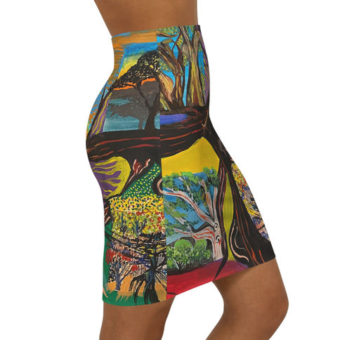 This mid-waist pencil skirt brings bold, painterly energy to everyday wear. The all-over print reads like a patchwork landscape—sweeping trees, twilight skies and rich, saturated colors—so each step becomes a little performance. The sculpting mid-waist cut hugs curves while the four-way stretch and elastic waistband move with you, offering comfort without losing a sleek silhouette. Wear it with a simple tee and boots for a creative day out, or pair with a fitted blouse for evenings when you want artful confidence.