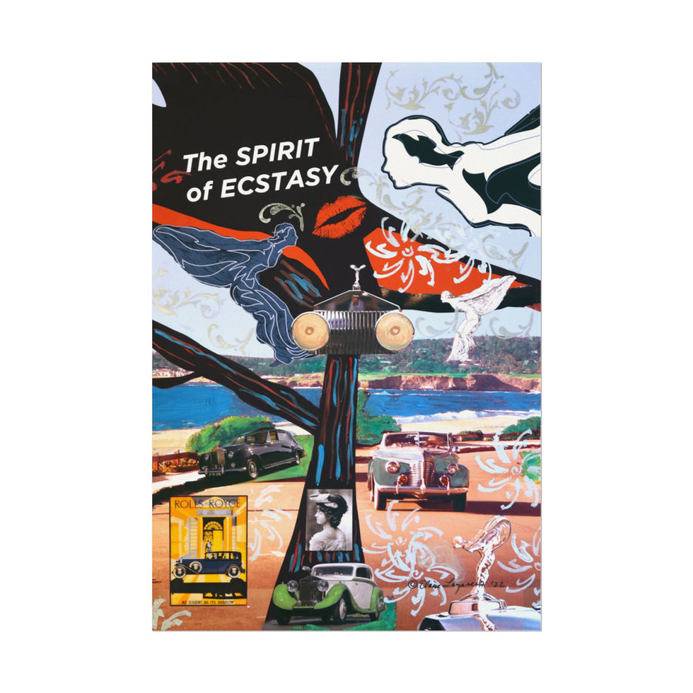 This work reinterprets the history of the Spirit of Ecstasy, the iconic Rolls-Royce hood ornament, through Lazarus’s ongoing investigation of femininity, desire, and visual culture. A branching tree functions as the central structural framework, organizing layered imagery of luxury, landscape, and fantasy. References to the coastline, vintage automobiles, the female form, and symbolic motifs such as lips, wings, and headlights merge to examine how attraction and status are constructed through cultural narratives and consumption. As in her broader practice, the body dissolves into landscape and object, revealing the instability between image, identity, and desire.